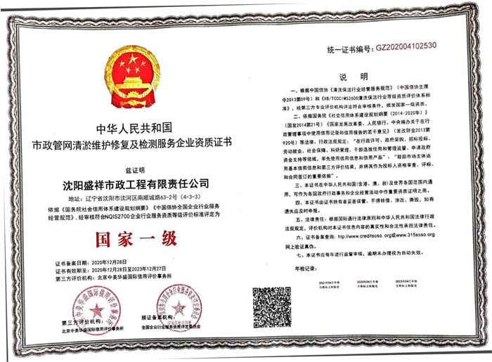市政管道清淤維護(hù)修復(fù)及檢測服務(wù)國家一級(jí)證書
